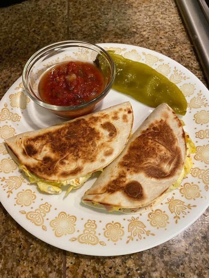 Breakfast quesadillas with fresh salsa and one luscious pepper, from the Yannarella pop up kitchen. Growing up, we always ate breakfast, usually a sturdy breakfast, a good start to the day, fuel for the body’s daily work. A special treat was reconstituted grape juice from that frozen can. I loved it.