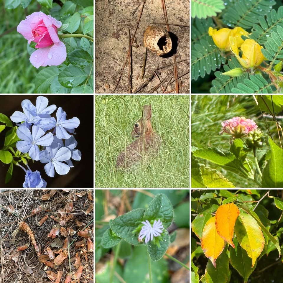 How can we not love this gorgeous world if we but look at it? So much richness, everywhere you look. The squirrel leavings, the tiny blossoms, the raindrops on the rose, the rabbit. The rabbit! Just look at those ears, those eyes.