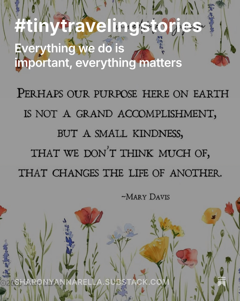 She walked away with a heartfelt thank you still echoing. She never saw the young family again, but she remembers them now and then, and thinks about them, and of the serendipity that flows through our lives, and of opportunities, and of what we choose to do with them, and of how we never know the importance in someone’s life of the things we do.
